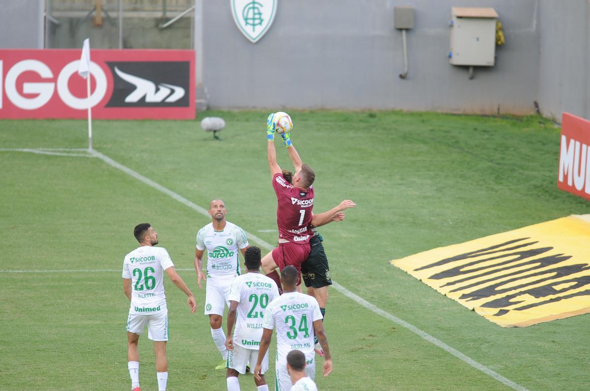 O América seguiu mais incisivo nos acréscimos do 1ºT. Felipe Azevedo arriscou o chute de fora da área, mas o arqueiro adversário fez mais uma defesa. Segundo o SofaScore, o América finalizou 10 vezes no 1ºT - três delas no gol. Já a Chape finalizou em sete ocasiões, mas apenas uma em direção às redes.