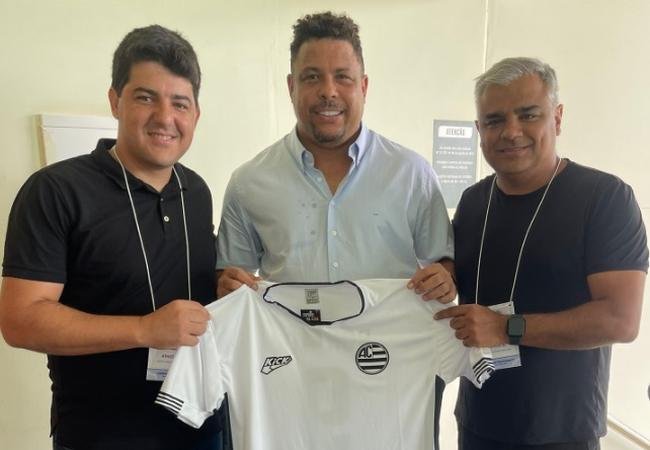 Proprietário do Grupo Futbraz, Vinicius Diniz, que é acionista da SAF do Athletic, e o diretor de futebol do clube, Fábio Mineiro, entregaram a camisa do Esquadrão de Aço a Ronaldo.