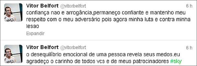 Vitor Belfort também usou o Twitter para se defender dos ataques de Wanderlei Silva. O carioca, que estava na expectativa de lutar na capital mineira, aproveitou para rebater Wanderlei Silva. “O desequilíbrio emocional de uma pessoa revela seus medos. Eu agradeço o carinho de todos vocês e de meus patrocinadores”, postou Belfort.