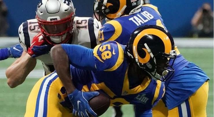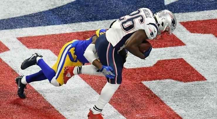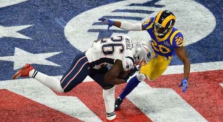 O primeiro touchdown do Super Bowl aconteceu na metade do último quarto com Sony Michel para o New England Patriots. O placar marcava 10 a 3. Faltando 4min24, Brandin Cooks teve a oportunidade de fazer o touchdown, mas a defesa dos Patriots conseguiu impedir a recepção.